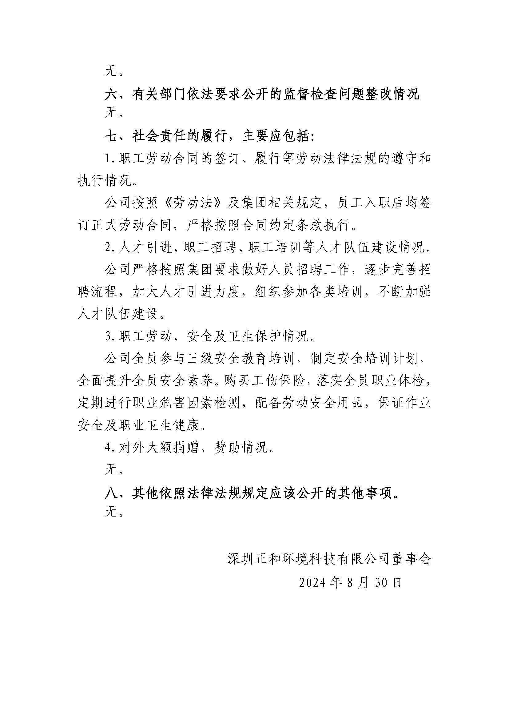 深圳正和环境科技有限公司2023年度重大信息公告
